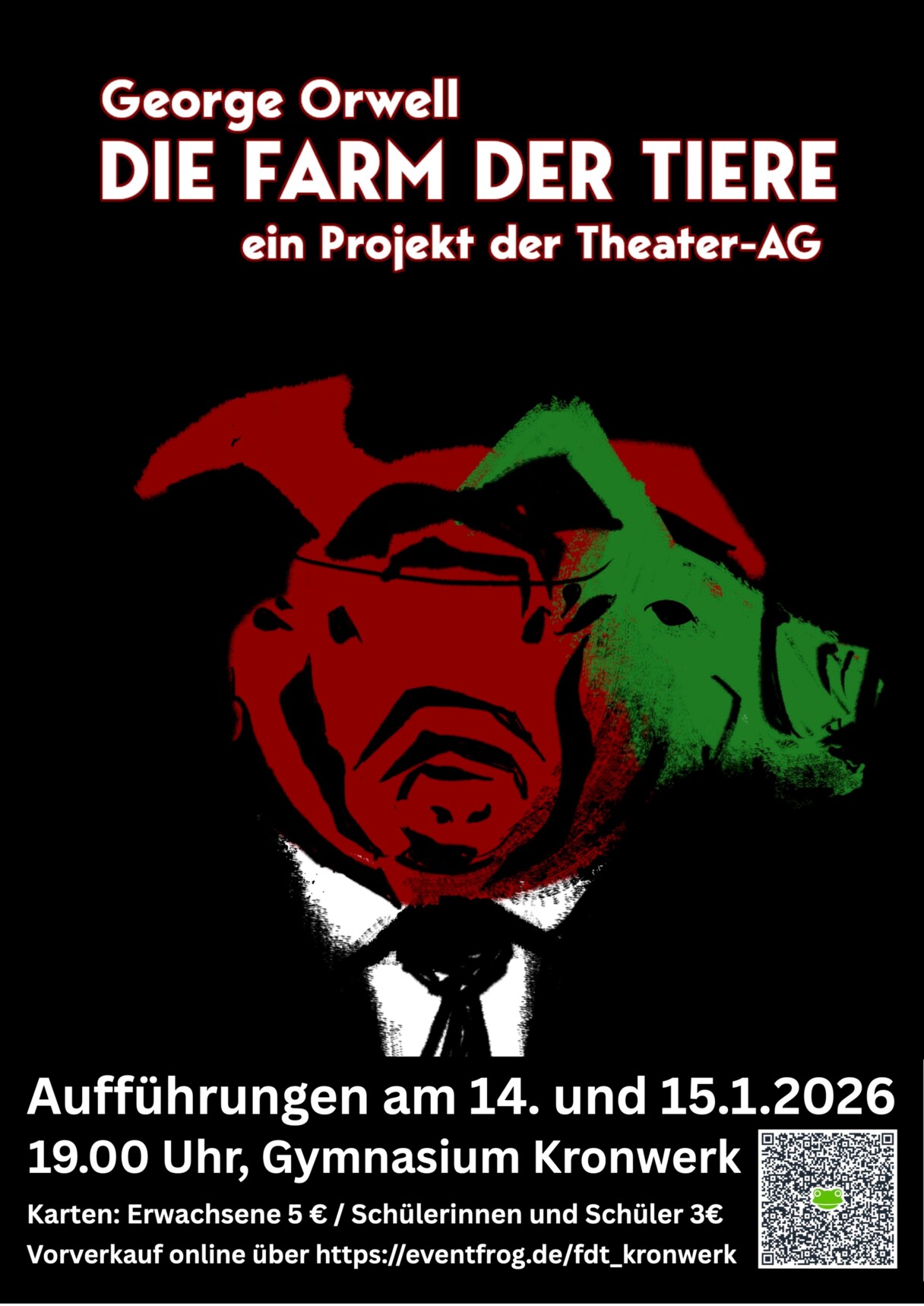 Die Mittelstufen-Theater-AG des Gymnasium Kronwerk präsentiert am 14. und 15. Januar ihre Bühnenversion von George Orwells Klassiker «Farm der Tiere».In der Bearbeitung der Fabel werden die Themen Gemeinschaft, Populismus und Machtmissbrauch zeitlos in einer bildstarken Bühnensprache behandelt.Die Aufführungen finden um 19 Uhr im Foyer des Gymnasium Kronwerk, Eckernförder Str. 58 b-d, Rendsburg statt. Karten gibt es im Vorverkauf auch online zu erwerben: https://eventfrog.de/fdt_kronwerk